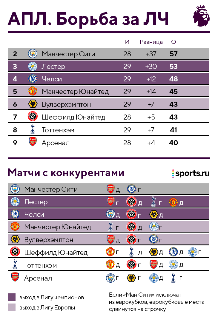 Стоит помнить, что если команда выигрывает еврокубок, но при этом квалифицируется в еврокубки через чемпионат, то она попадает в Европу по внутренней квоте, а не по европейской. Поэтому, если «Челси» финиширует в первой семерке и выиграет Лигу конференций, место в Лиге Европы будет утеряно, и «синие» попадут в тот еврокубок, на который они квалифицируются через чемпионат. То же самое касается «Манчестер Юнайтед», «Тоттенхэма» и «Астон Виллы».