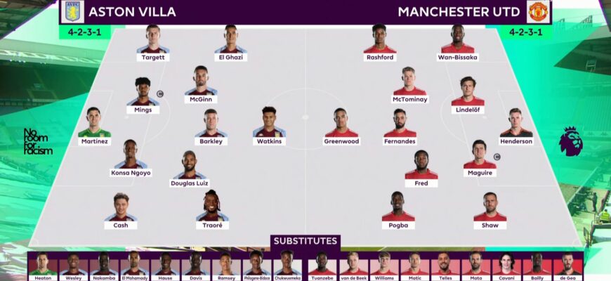 Эмилиано Мартинес; Люка Динь, Тайрон Мингс, Эзри Конса, Мэтти Кэш; Юри Тилеманс, Бубакар Камара; Джейкоб Рэмзи, Джон МакГинн, Морган Роджерс; Маркус Рашфорд.