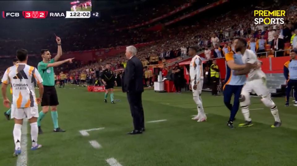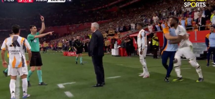 Напряженный финал Кубка Короля, который можно назвать одним из самых «спокойных» за последнее время, не обошелся без ложки дегтя. Несмотря на предматчевую полемику, сам поединок, за исключением нескольких эпизодов, оставался в рамках спортивной борьбы, что радует. Однако, после гола сине-гранатовых в концовке овертайма, на скамейке мадридцев произошли удаления. Все началось с эпизода, когда Мбаппе прорывался к штрафной и сфолил на Гави, ударив его рукой по лицу. Это спровоцировало бурную реакцию у игроков «Реала».